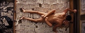 Naturally, there's a lot of sex in the movie, mostly between Belfort and his wife (played by Robbie). At one point they even do it on top of a huge pile of money, because a scene where they copulate on a bed full of electric bills and soiled pizza boxes would be too depressingly familiar for most of us.