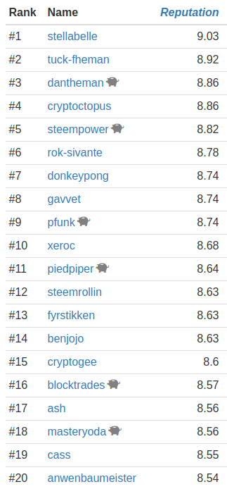 For those who don't know yet, every account on steem now has a reputation. It was so very logical to add it to steem whales, as it is obviously something we want to sort by. Steem Whales displays your reputation more accurately (with 2 decimals), this way you know how far you are from the next step.